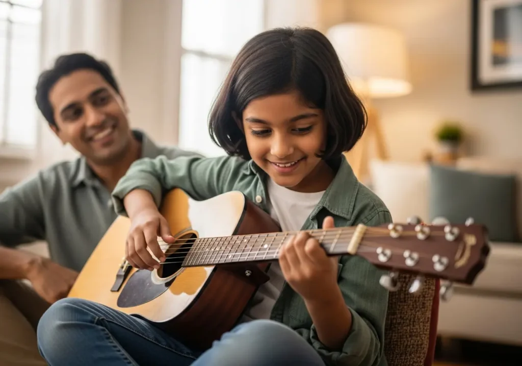Kids under 10 respond better to 3/4 or travel-size instruments. Yamaha JR series and similar compact guitars are widely available and priced affordably (₹5,000–₹12,000).